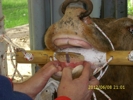 A media mañana, con una temperatura ambiental más agradable, nos reunimos en la manga para que el Dr. Javier Pralong, Director Técnico del laboratorio Romat, presentara la versión 2012 de las prótesis dentales bovinas Nocut. Dichas prótesis dentales cuentan con el agregado de una placa de acero inoxidable que brinda al animal mayor capacidad de corte.