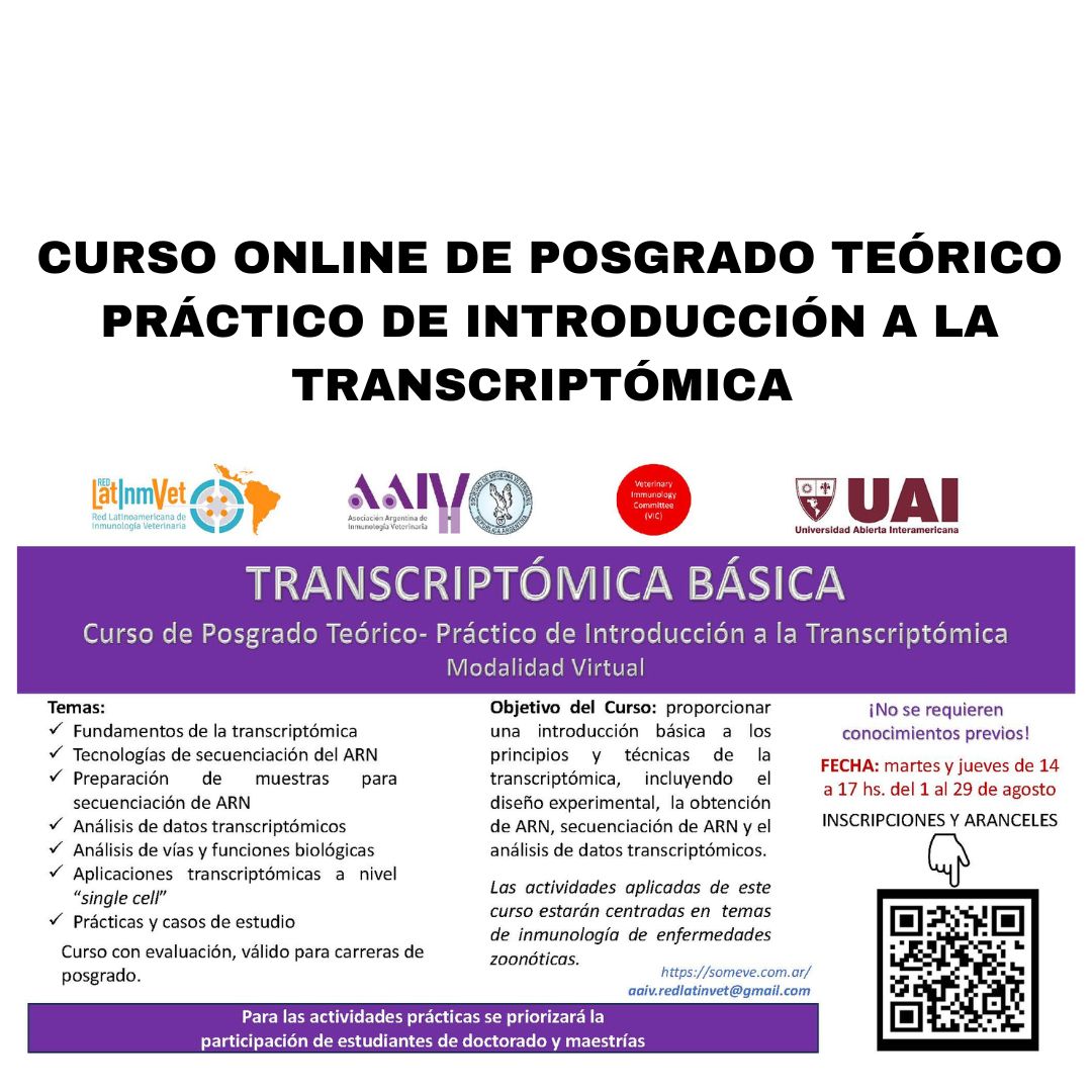Este curso es organizado por la Asociación Argentina de Inmunología Veterinaria (AAIV) en colaboración con la Red Latinoamericana de Inmunología Veterinaria (RedLatInmVet), con el apoyo del Comité de Veterinaria (VIC) de la IUIS y la Universidad Abierta Interamericana (UAI). Se llevará adelante del 1º al 29 de agosto de 2024, los días martes y jueves de 14 a 17h (hora argentina). TAGS: Inmunología Veterinaria. Transcriptómica. Curso posgrado online. Medicina veterinaria.