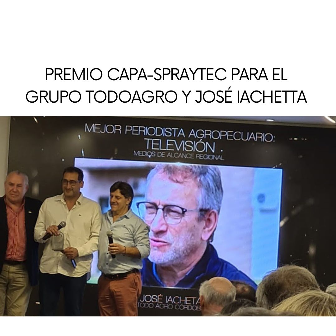 En una votación nacional, Grupo TodoAgro con base en Villa María y el periodista José iachetta recibieron el premio del Círculo Argentino de Periodistas Agropecuarios nominado este año como Capa-Spraytec. TAGS: Grupo TodoAgro. José iachetta. Premio Capa-Spraytec. Círculo Argentino de Periodistas Agropecuarios. Periodistas agropecuarios