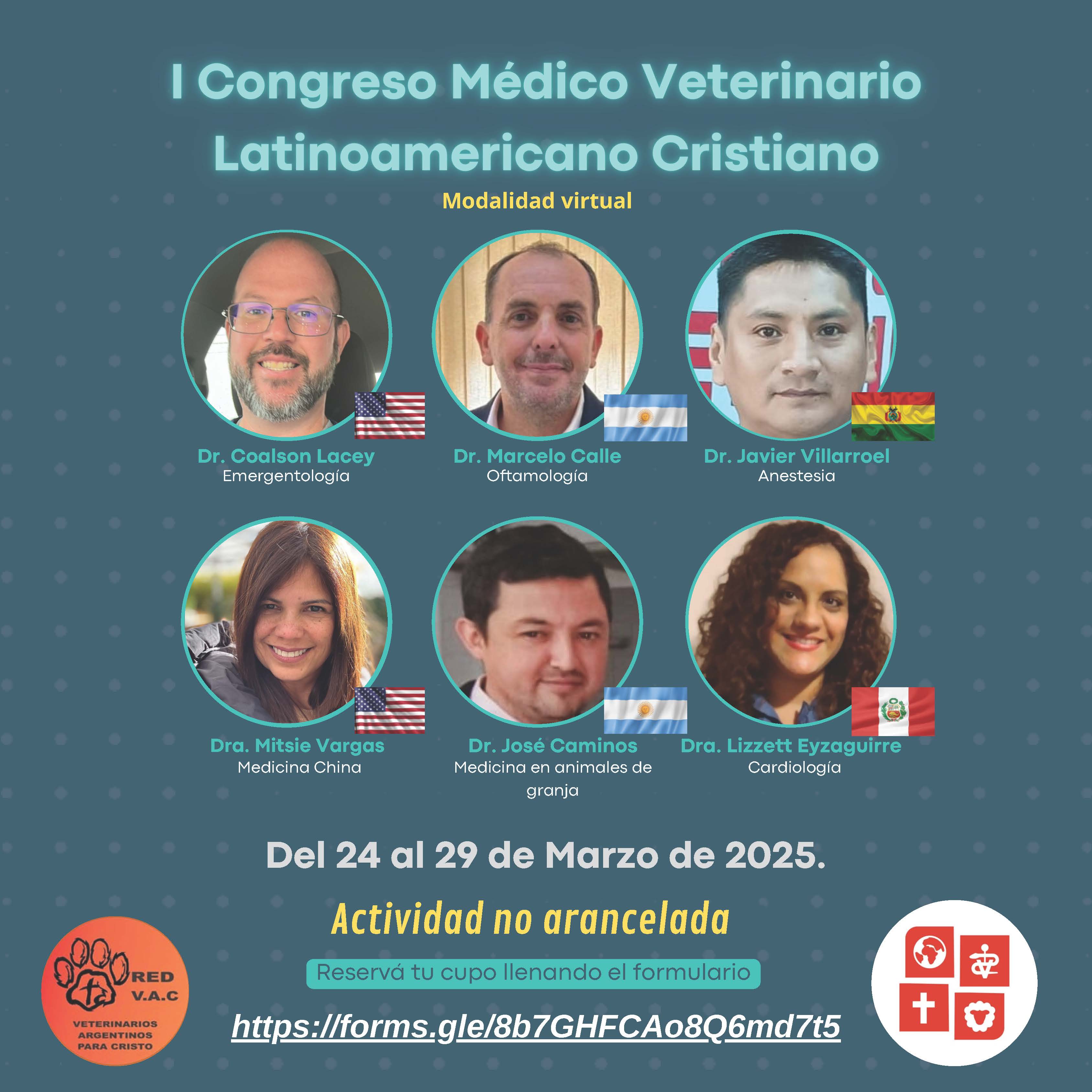 Del 24 al 29 de marzo de 2025 se desarrollará el 1er. Congreso Médico Veterinario Latinoamericano Cristiano, en modalidad virtual. TAGS: Congreso veterinario latinoamericano. Medicina veterinaria. Veterinaria. Congreso online