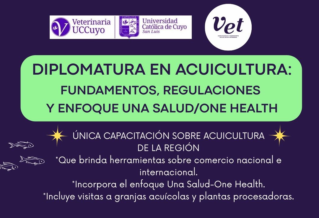Vet Comunicaciones, en el marco de su convenio con la Facultad de Ciencias Veterinarias de la UCCuyo, lanza la Diplomatura online en Acuicultura: Fundamentos, Regulaciones y Enfoque Una Salud / One Health, única en la región que combina conocimientos técnicos, actualización normativa y un enfoque integral basado en el concepto Una Salud / One Health. TAGS: Acuicultura. Producción de peces. Comercio nacional e internacional de peces. Industria pesquera. Una Salud. One Health. Vet Comunicaciones. Facultad de Veterinaria, UCCuyo