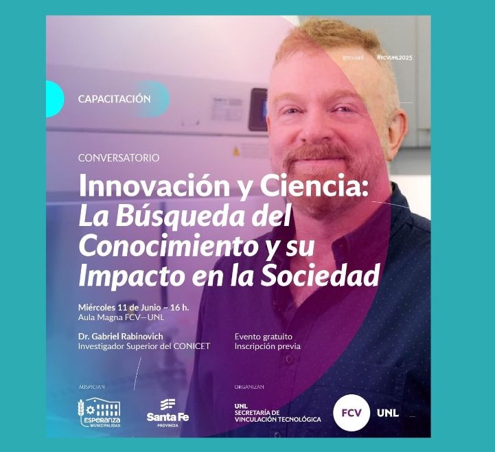 El próximo 11 de junio, a las 16:00 horas, el Dr. Gabriel Rabinovich, bioquímico y doctor en Ciencias Químicas, llevará adelante el conversatorio titulado “Innovación y Ciencia: La búsqueda del conocimiento y su impacto en la sociedad” en el Auditorio de la Facultad de Ciencias Veterinarias de Esperanza. TAGS: Innovación. Ciencia. Impacto social. Conversatorio