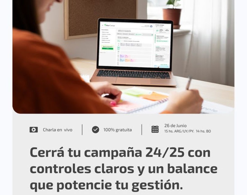 El próximo jueves 26 de junio, a las 15:00 horas (Arg/Uru) y 14:00 horas (BO/PY), se llevará a cabo un webinar gratuito dirigido a productores y asesores del sector agropecuario. La actividad, titulada "Cerrá tu campaña 24/25 con controles claros y un balance que potencie tu gestión", ofrecerá herramientas prácticas para convertir el cierre de campaña en un momento clave para optimizar la gestión empresarial. TAGS: Gestión de empresa. Rentabilidad del campo. Sector agropecuario