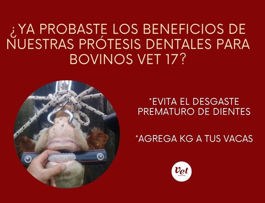 Prótesis Dentales para Bovinos Vet 17, un producto específicamente diseñado para extender la vida productiva y reproductiva de tus vacas, mejorar su estado corporal y reducir los costos de reposición.