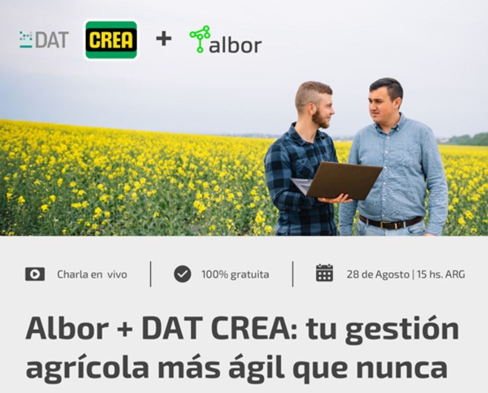 En su compromiso por impulsar la digitalización de la gestión agrícola, Albor convoca a un webinar gratuito el próximo jueves 28 de agosto a las 15 hs, donde mostrará, paso a paso, cómo generar y enviar el archivo DAT CREA desde Albor Campo, incluyendo los datos clave de los cultivos. Esta sesión facilita la preparación de informes para una planificación estratégica más eficiente del negocio agropecuario. TAGS: Digitalización Agro. Agtech. Gestión agrícola. Albor Campo. Webinar agro. DATCREA. Innovación rural. Planificación agropecuaria