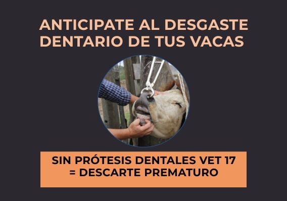 Una vaca con desgaste dentario tiene más riesgo de perder su condición corporal y, por lo tanto, dejar de producir terneros. Con las prótesis dentales Vet 17 el animal puede sostener su producción y generar hasta dos terneros más, que es el tiempo promedio de duración de la prótesis. Te ofrecemos el Kit de las Prótesis dentales Vet 17 con capacitación incluida. TAGS: Prótesis dentales bovinas. Ganadería eficiente. Producción bovina. Veterinaria rural. Ganado bovino. Rentabilidad ganadera