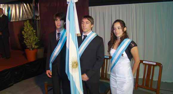 Como en cada acto de colación, se renuevan los abanderados de la Facultad. En esta oportunidad, los salientes Julián Alberto, Andrés Moschen y Nicolás Baronetti entregaron la enseña Patria a sus sucesores Erié Mchin y los escoltas José Grimaldi y Paula Fuster.